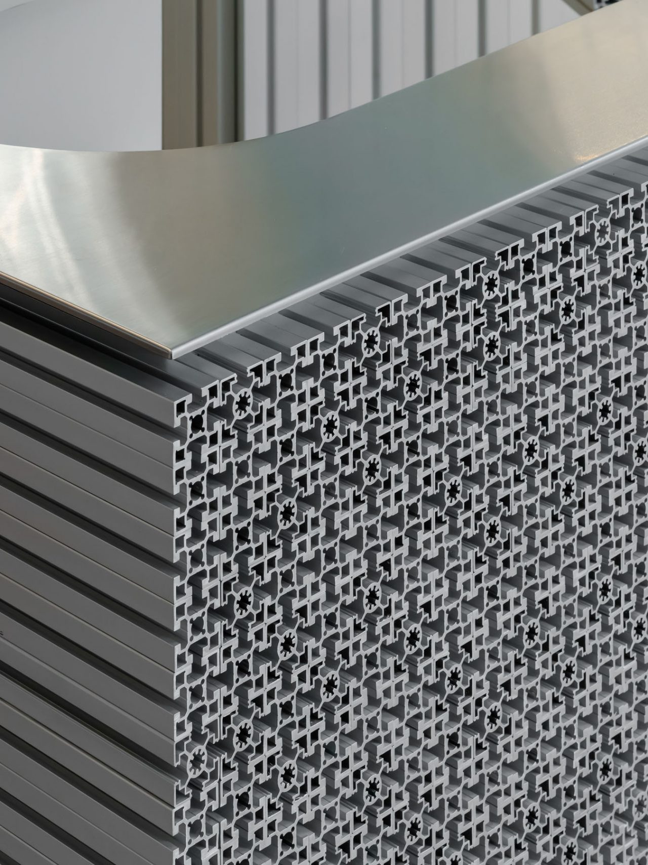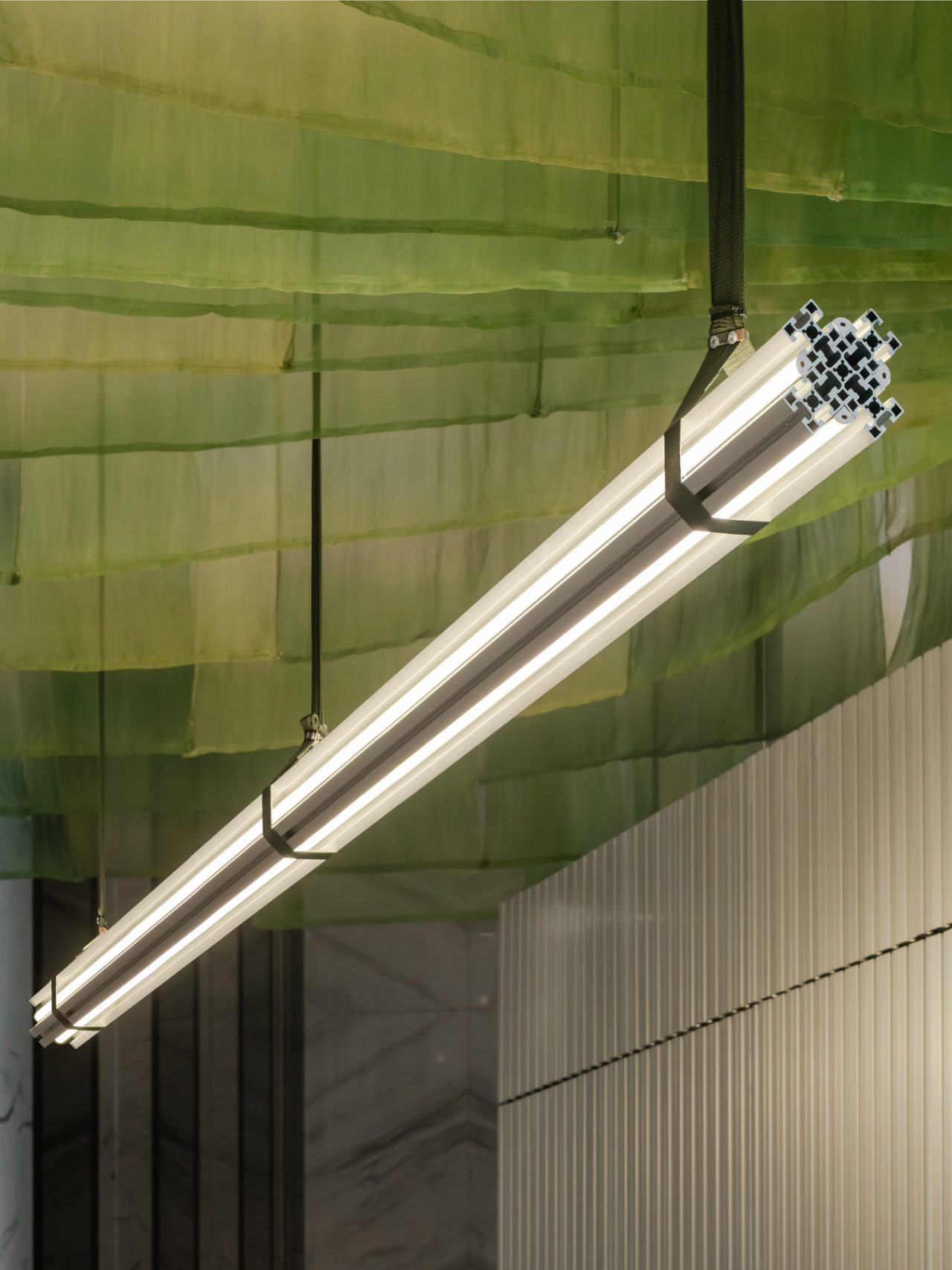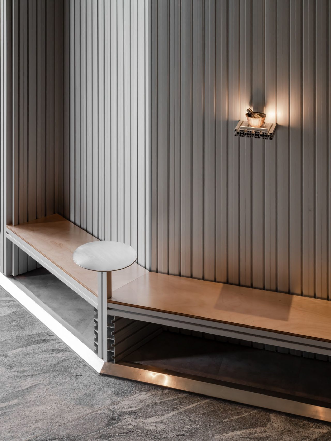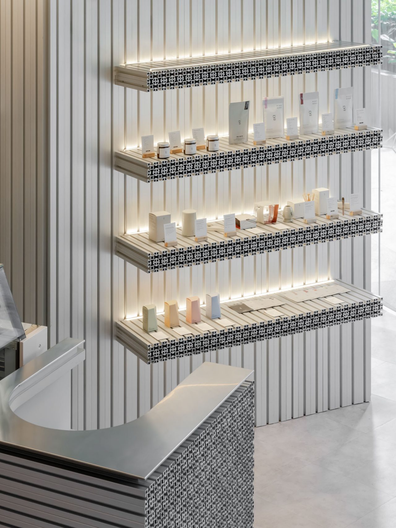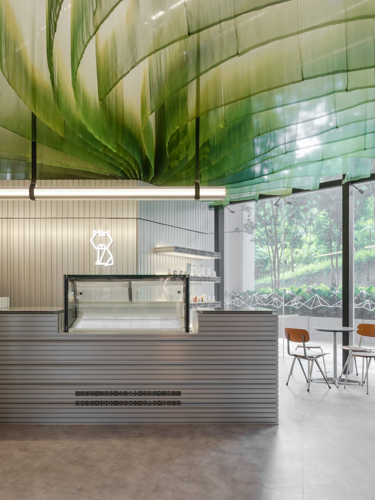 Beneath this floating installation, the café’s clean, modern aesthetic provides a grounded contrast, focusing on craftsmanship and simplicity. The entire bar counter and surrounding walls are clad in vertical aluminum profiles is an intentional choice to introduce a sleek, lab-like precision to the space. This use of aluminum not only reflects the minimalist ethos of Japanese tea culture but also reinforces a sense of order, refinement, and quiet intensity. Its subtle sheen interacts with the lighting to echo the clean, crisp nature of a matcha atelier, while the tactile rhythm of the profiling adds a layer of quiet dynamism to the space.