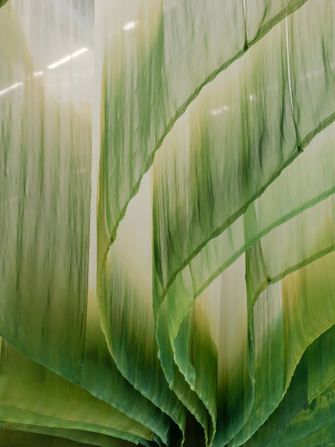 The fabric is dyed by artist Duniamotif in varying shades of green, from deep forest hues to vibrant matcha tones, with subtle gradients that shift like the luminous glow of an aurora. This effect evokes the natural transformation of matcha as it is whisked, starting as a deep green powder and becoming a light, frothy suspension. The sweeping motion of the fabric, designed to mimic the fluid gestures of a bamboo whisk, reinforces the meditative, ritualistic nature of matcha-making. Soft, diffused lighting enhances the translucency of the fabric, allowing it to shift in tone throughout the day, much like the ever-changing sky.