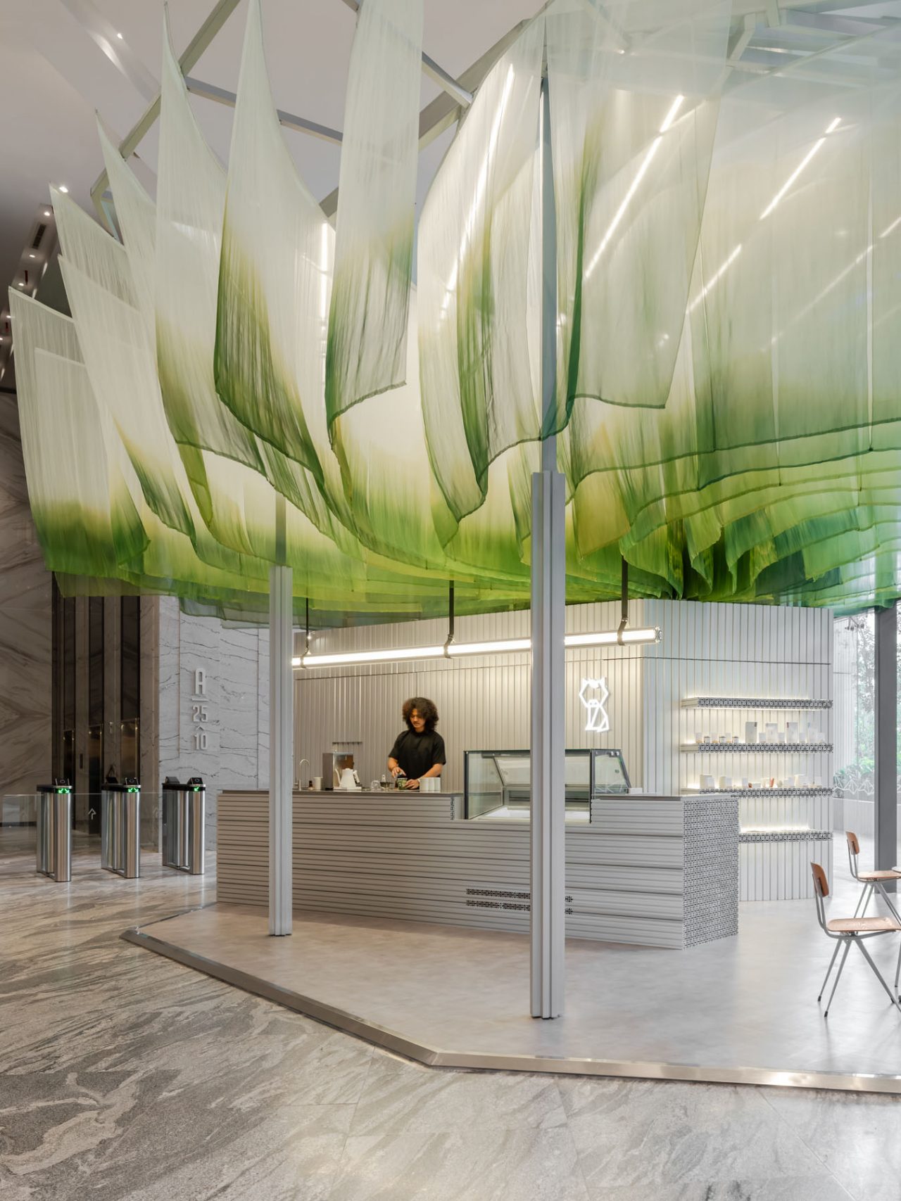 Drawing inspiration from the intricate ritual of matcha preparation, our design showcases a striking ceiling installation of hand-dyed fabric. These flowing layers drift overhead in rhythmic motion, capturing the graceful swirl of whisked matcha and the fluid elegance of silk drifting in the air.