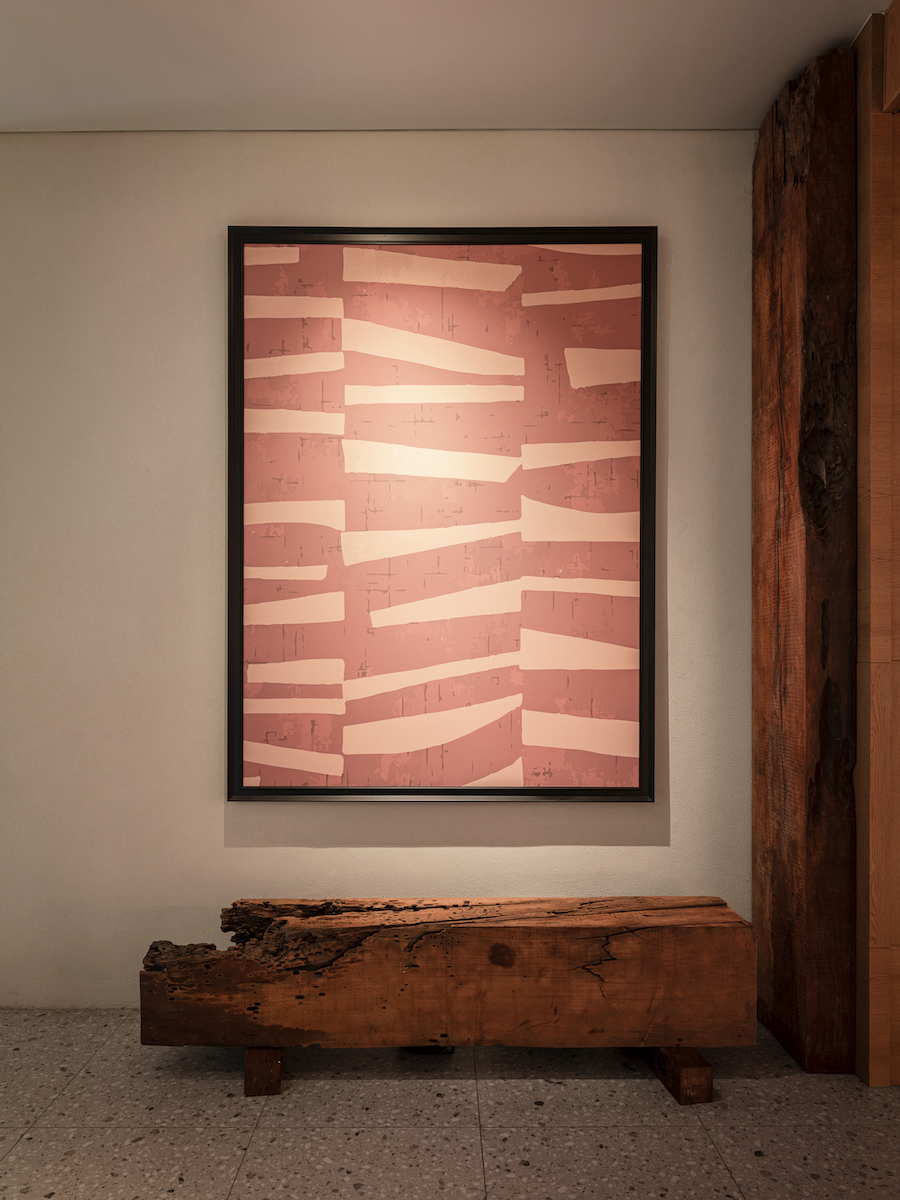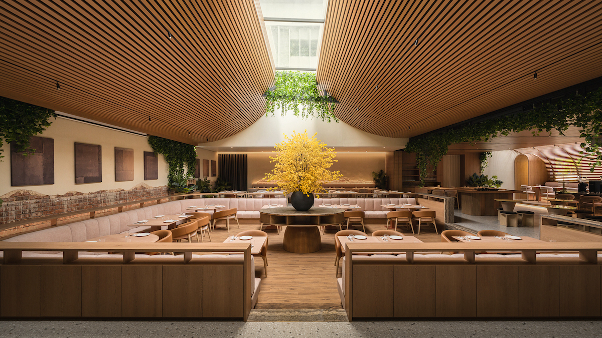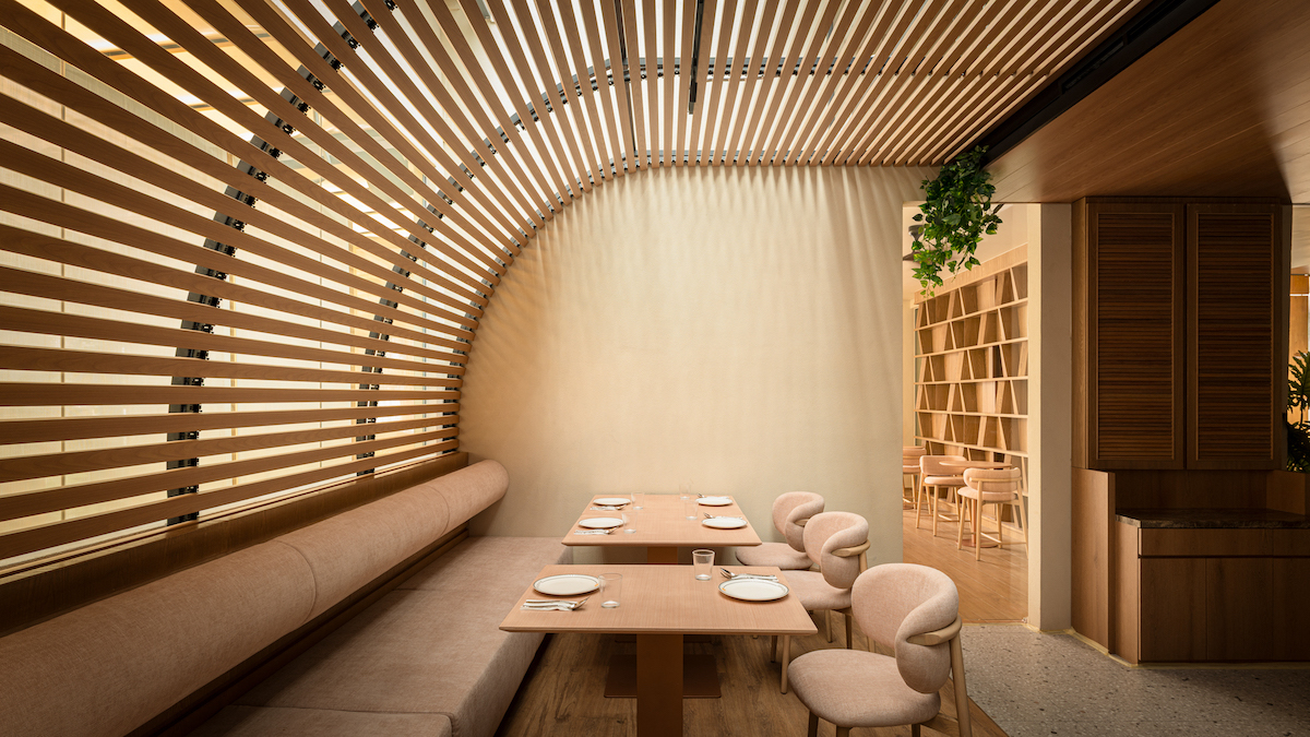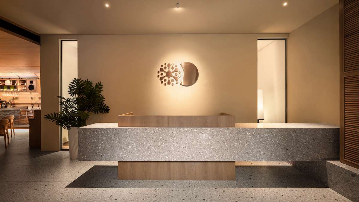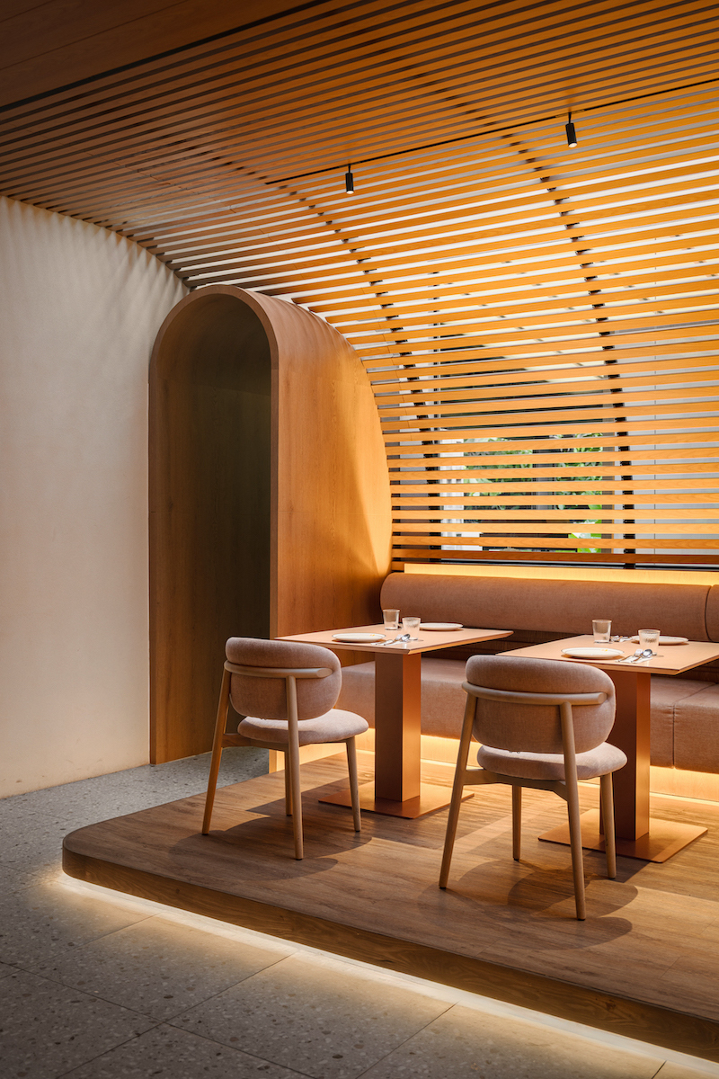 At the entrance, an ebony tree stands beneath a circular skylight, giving the impression that it grows through the building acting as the waiting area for guest. Inside, the Sun Bar’s glass ceiling is wrapped in timber slats that filter natural light and cast shifting shadows throughout the day, while a grey travertine counter provides a sculpted focal point for the daytime café identity.