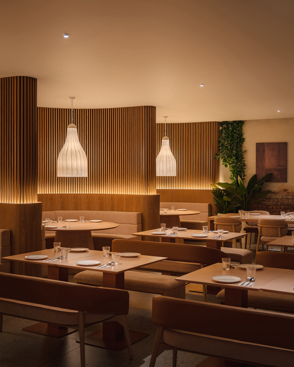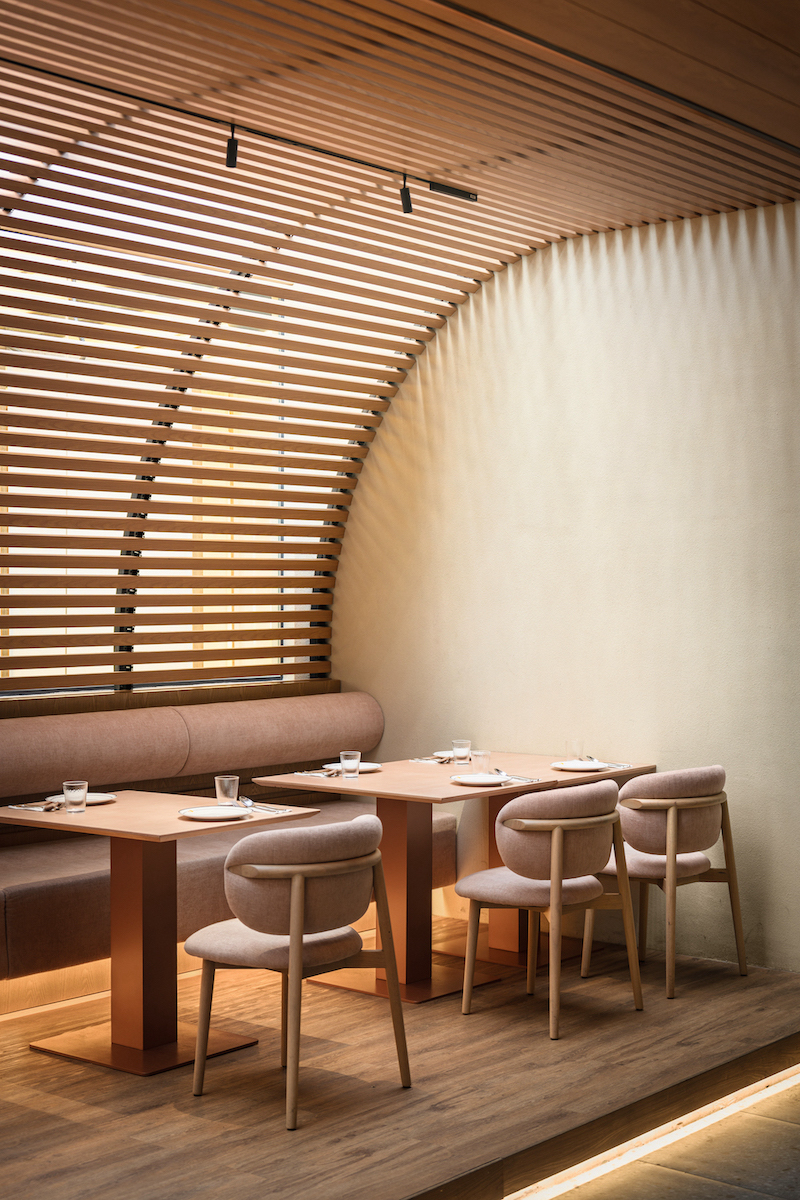 Around the periphery, semi-private dining nooks are formed by sculptural vertical timber slats, offering moments of enclosure without disrupting spatial openness. These niches echo Scandinavian ideals of human-scaled comfort while maintaining seamless connectivity with the main dining floor.