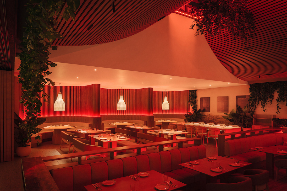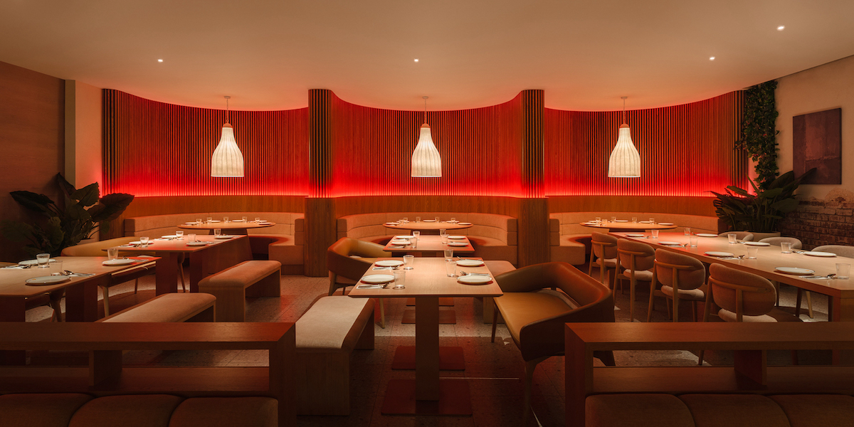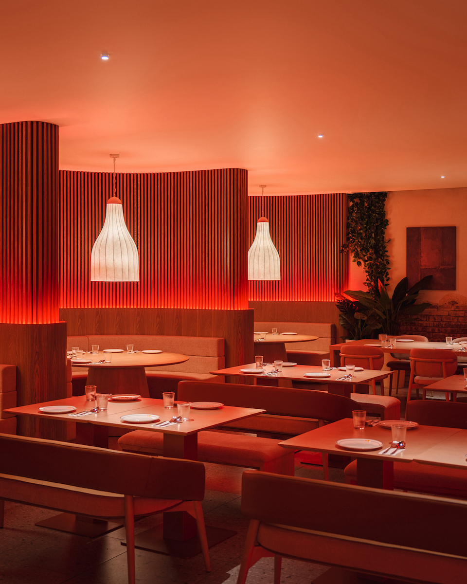 The heart of the project, however, is the sunken pit dining area, which forms the true core of the entire restaurant. Set beneath a linear skylight that spans the length of the room, this recessed zone gathers daylight in a dramatic yet serene way, creating a natural gathering place that anchors the flow of the restaurant. The sunken level enhances intimacy while maintaining visual connection to the rest of the space, becoming the central social and atmospheric nucleus. By day, it is filled with soft, luminous natural light; by night, it transforms into the vibrant centre of the lounge experience, framed by warm ambient lighting and rhythmic shadows.