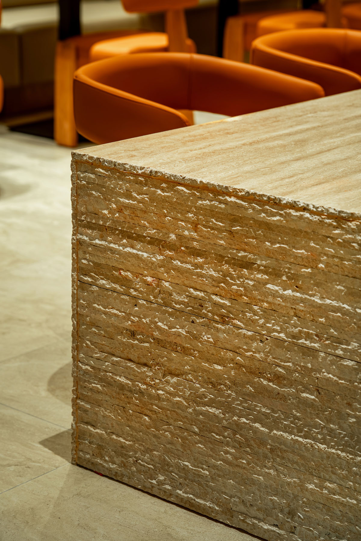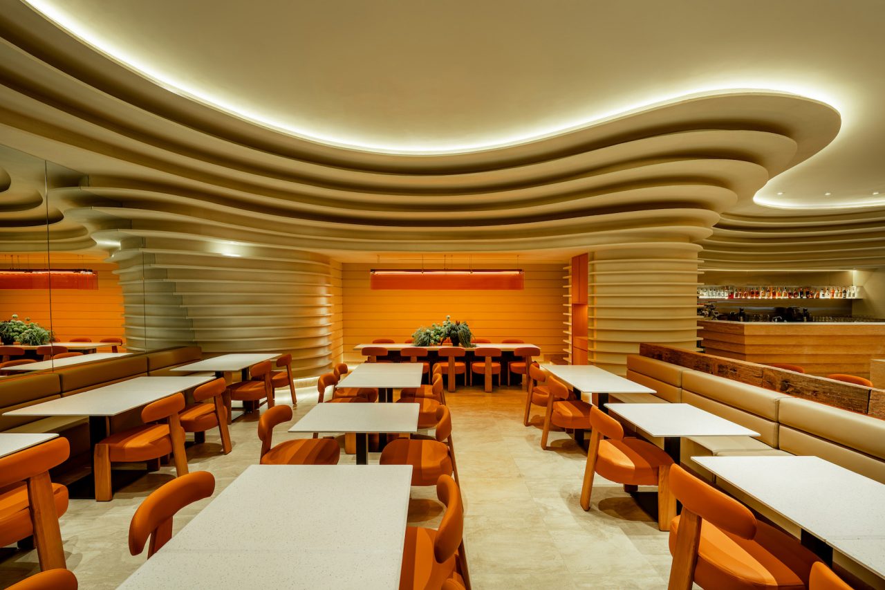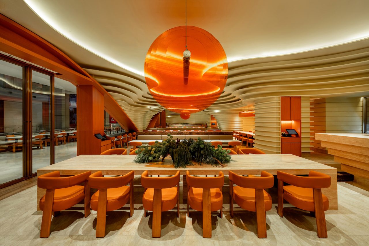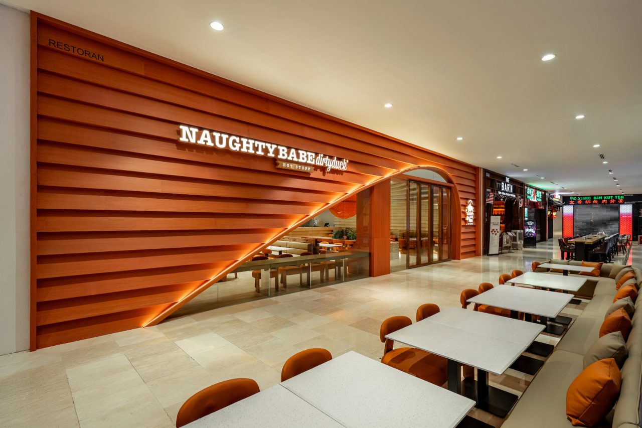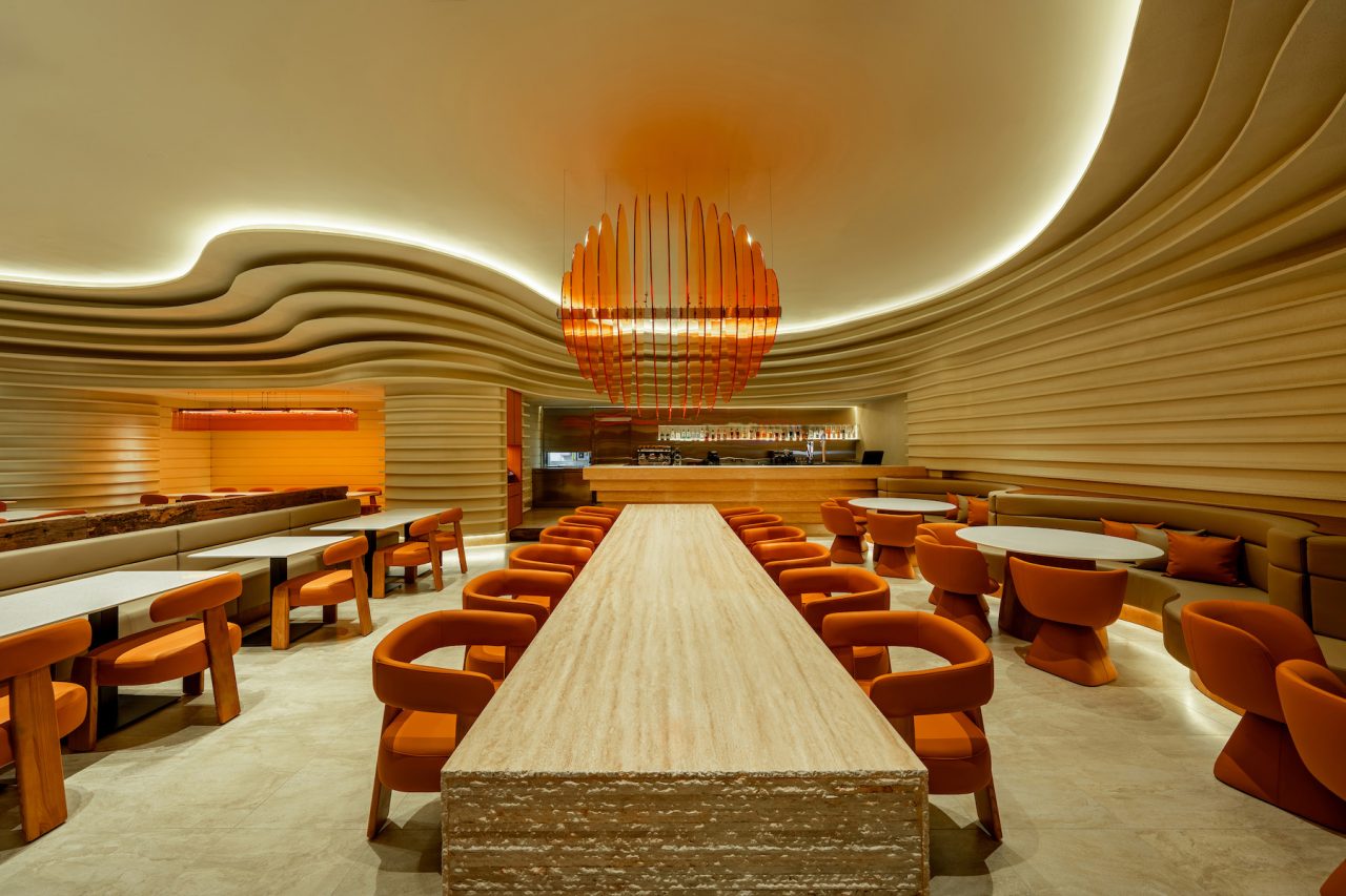 Inspired by geological formations, Naughty Babe Dirty Duck at Pavilion Kuala Lumpur, translates the language of strata and erosion into a contemporary dining space. Travertine and timber surfaces ripple through the restaurant, anchored by a glowing acrylic light sculpture that evokes the warmth of sunlight in a canyon.