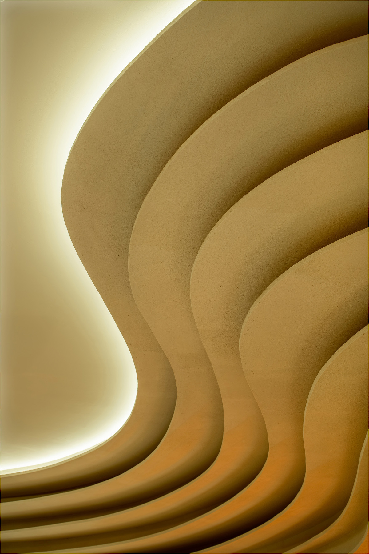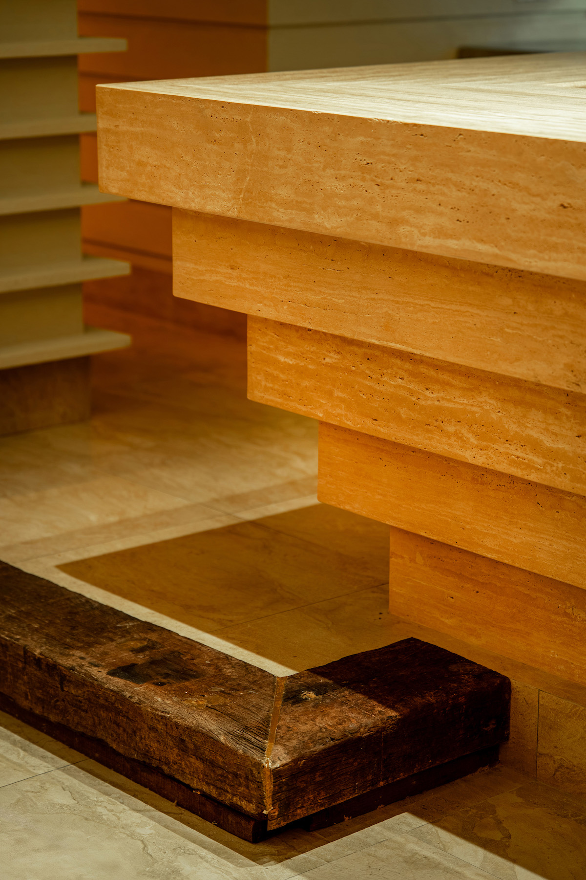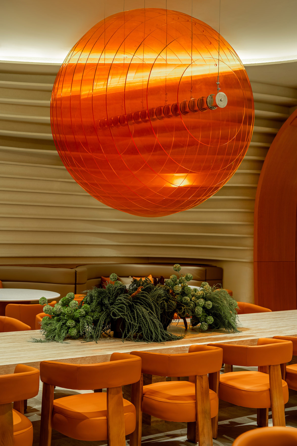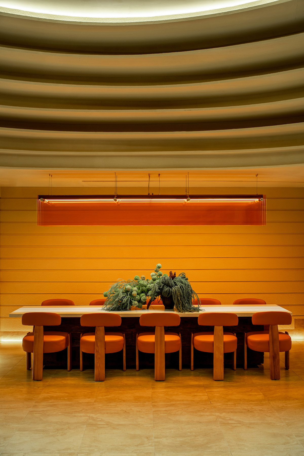 Inspired by geological formations, Naughty Babe Dirty Duck at Pavilion Kuala Lumpur, translates the language of strata and erosion into a contemporary dining space. Travertine and timber surfaces ripple through the restaurant, anchored by a glowing acrylic light sculpture that evokes the warmth of sunlight in a canyon.
